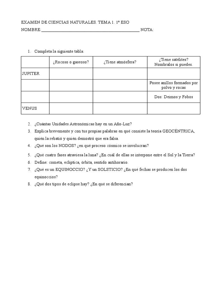 Examen Del Tema 1 De Biologia Y Geologia De 1ºeso El Universo Y La Tierra Pdf