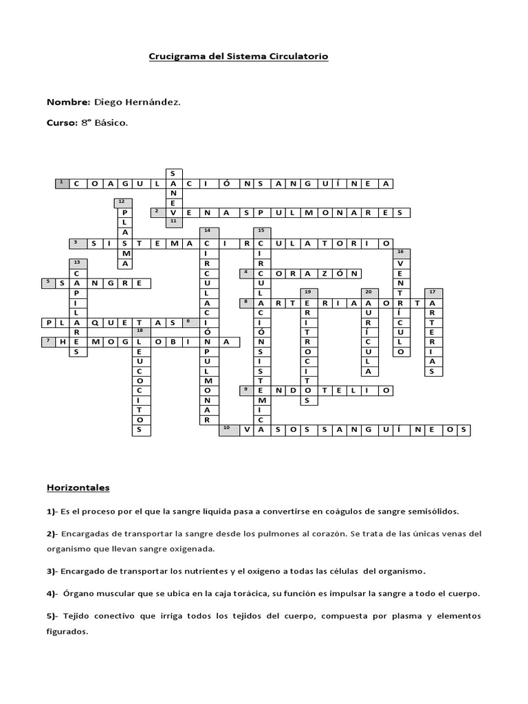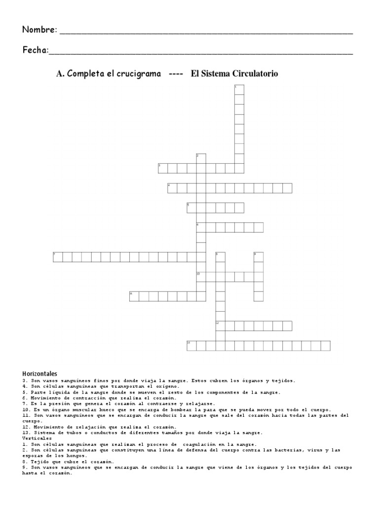 Crucigrama del sistema circulatorio. Completa el crucigrama ---- El Sistema Circulatorio Horizontales 3. Son vasos sanguneos finos por donde viaja la sangre.