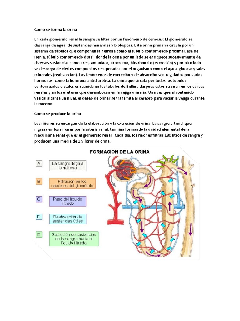 Donde se produce la orina. En la misma linea cómo se forma y sale la orina de nuestro cuerpo. El filtrado absorbido en el glomérulo fluye por el túbulo renal donde los nutrientes y el agua se reabsorben por los capilares. La orina se compone de aproximadamente 95 de agua y 5 de residuos.