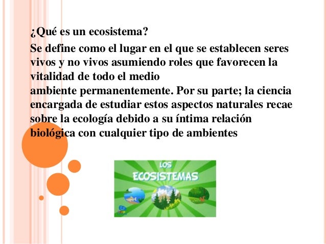 Un ecosistema es el conjunto formado por los seres vivos y los elementos no vivos del ambiente y la relación vital que se establece entre ellos. Las categorías generales de los ecosistemas terrestres se conocen como biomas. Mediante procesos como la depredación el parasitismo la competencia y la simbiosis y con su ambiente al desintegrarse y volver a ser parte del ciclo de energía y de nutrientes.