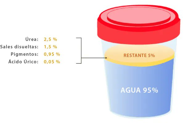 Composición de la Orina El ser humano elimina aproximadamente 14 litros de orina al día. Cerca de la mitad de los sólidos que contiene son urea el.