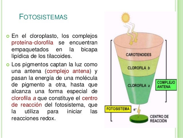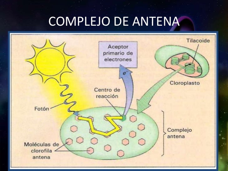 Que es un complejo antena. Especialmente unidas resulta en la transferencia de un electrón a un receptor A. El modelo que surge es el de unas 300 moléculas de clorofila y 40 carotenos beta y otros pigmentos accesorios que actúan como una antena de recolección de luz alrededor de una molécula de clorofila que forma parte de un centro de acción. Este complejo esta formado por ribonuicas endosiformes y NADPH.